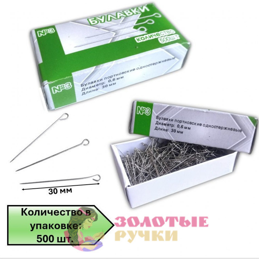 Булавки портновские одностержневые №3. Диаметр: 0,6 мм. Длина 30 мм. Количество в упаковке: 500 шт.