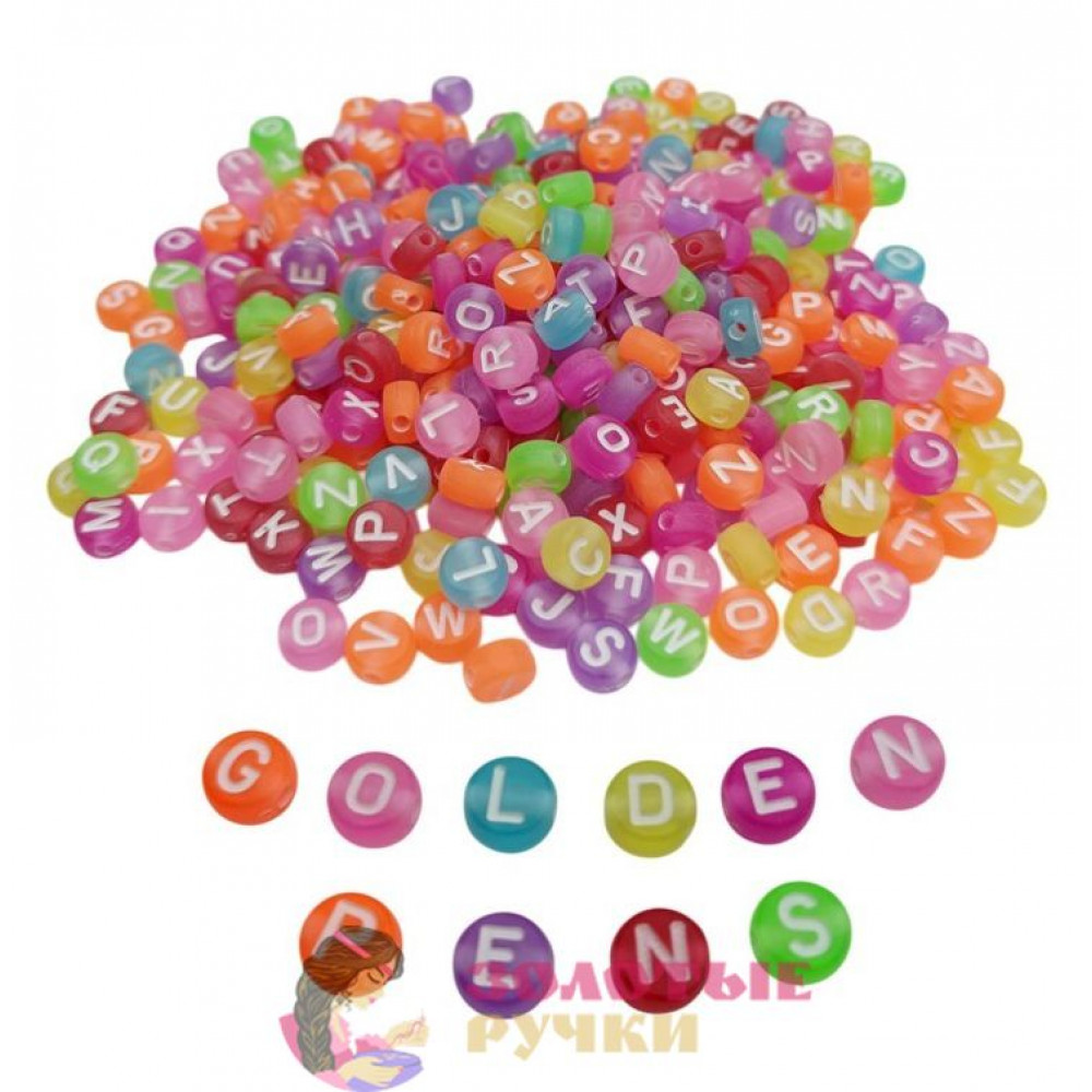 Бусины круглые с английскими буквами. Цвет: разноцветные с белыми буквами. Количество в упаковке: 500 гр.