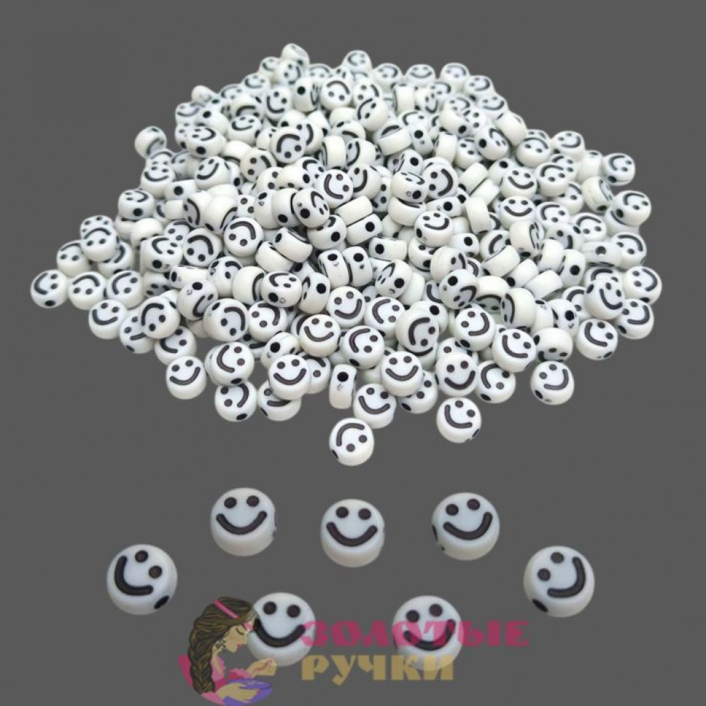 Бусины круглые "Смайлик". Цвет: белый с черными смайликами. Количество в упаковке: 500 гр.