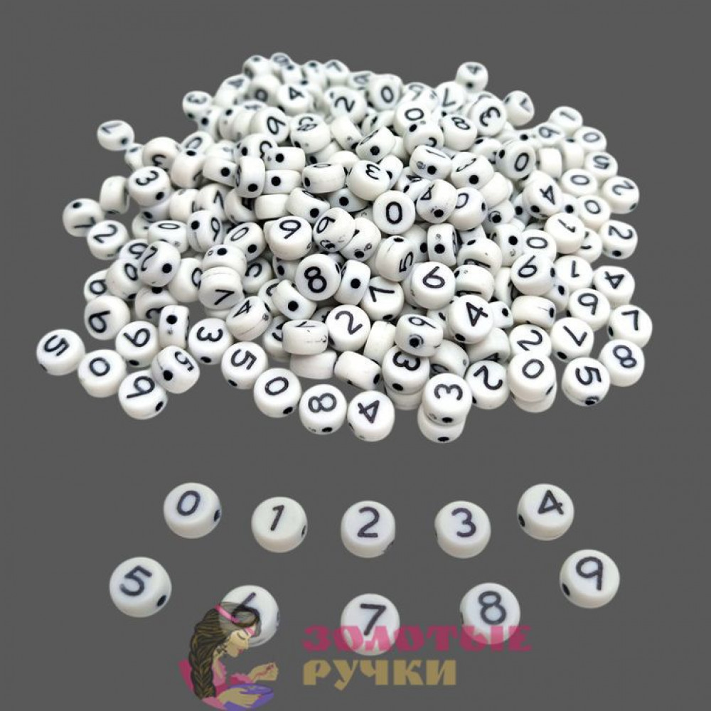 Бусины круглые "Цифры". Цвет: белый с черными цифрами. Количество в упаковке: 500 гр.