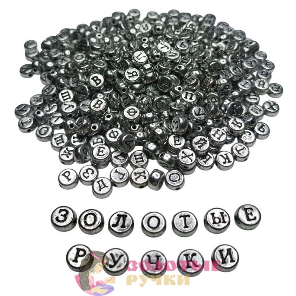 Бусины круглые с русскими буквами. Цвет: серебро с черными буквами. Количество в упаковке: 500 гр.