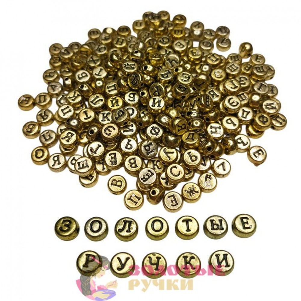 Бусины круглые с русскими буквами. Цвет: золотые с черными буквами. Количество в упаковке: 500 гр.