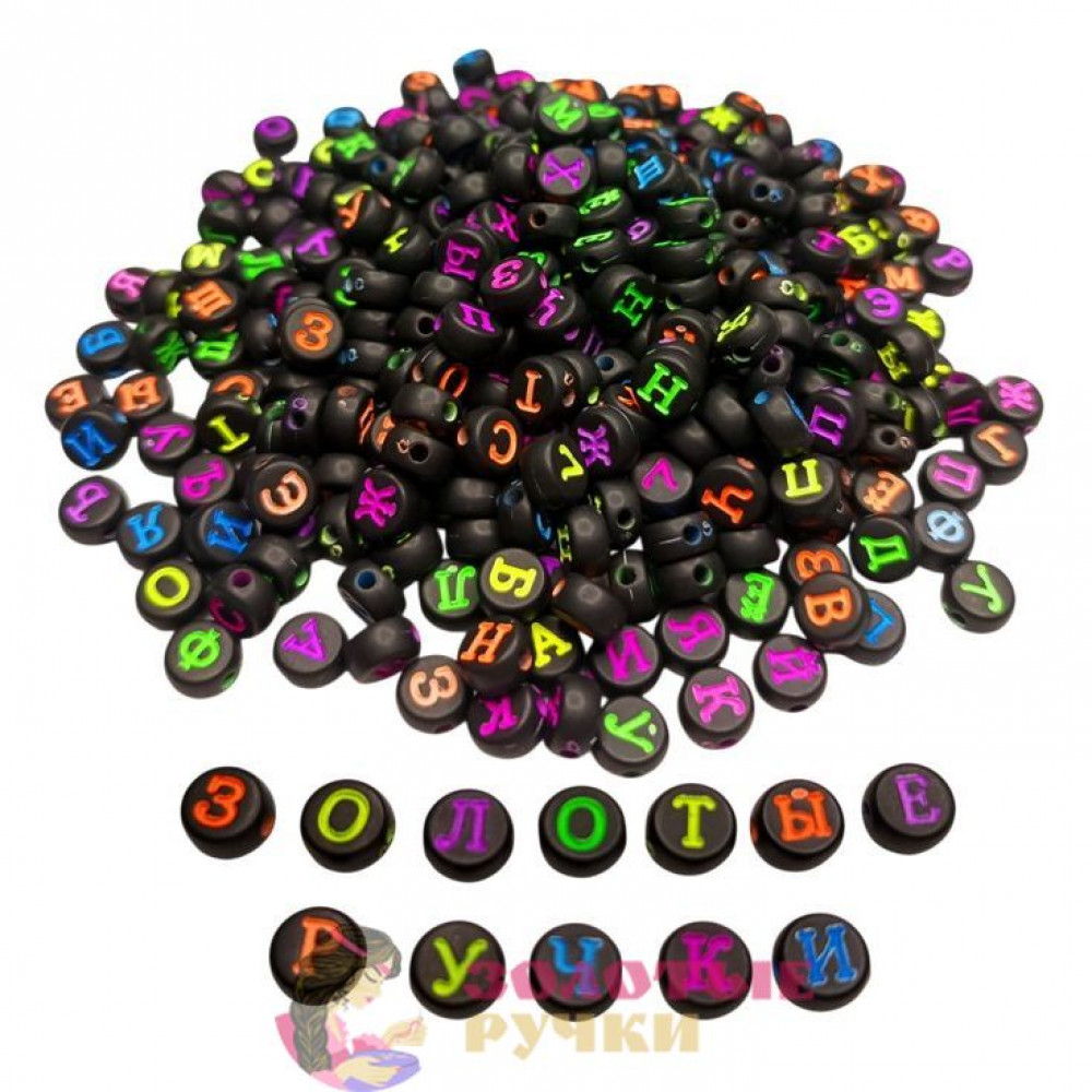 Бусины круглые с русскими буквами. Цвет: черный с разноцветными буквами. Количество в упаковке: 500 гр.
