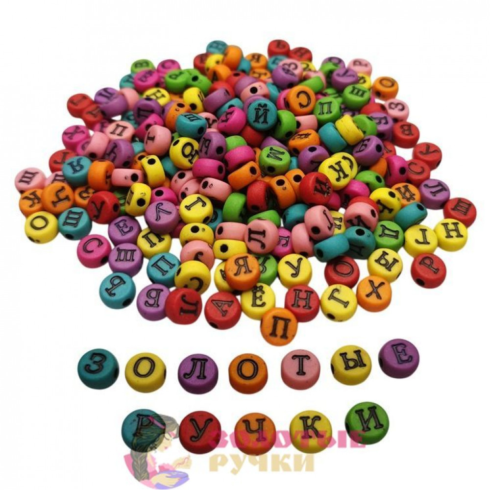 Бусины круглые с русскими буквами. Цвет: разноцветные с черными буквами. Количество в упаковке: 500 гр.