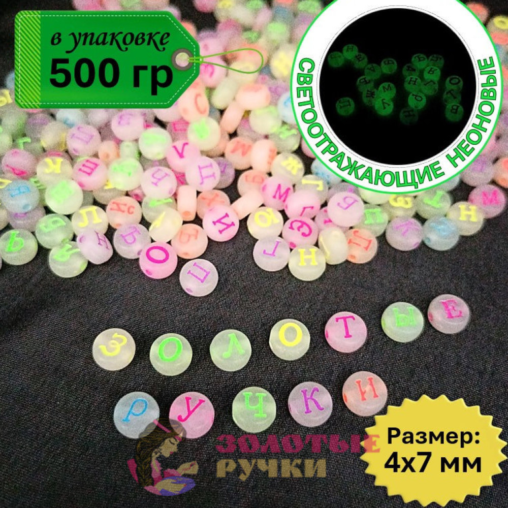 Бусины круглые с русскими буквами. Цвет: белые с разноцветными буквами светоотражающие неоновые