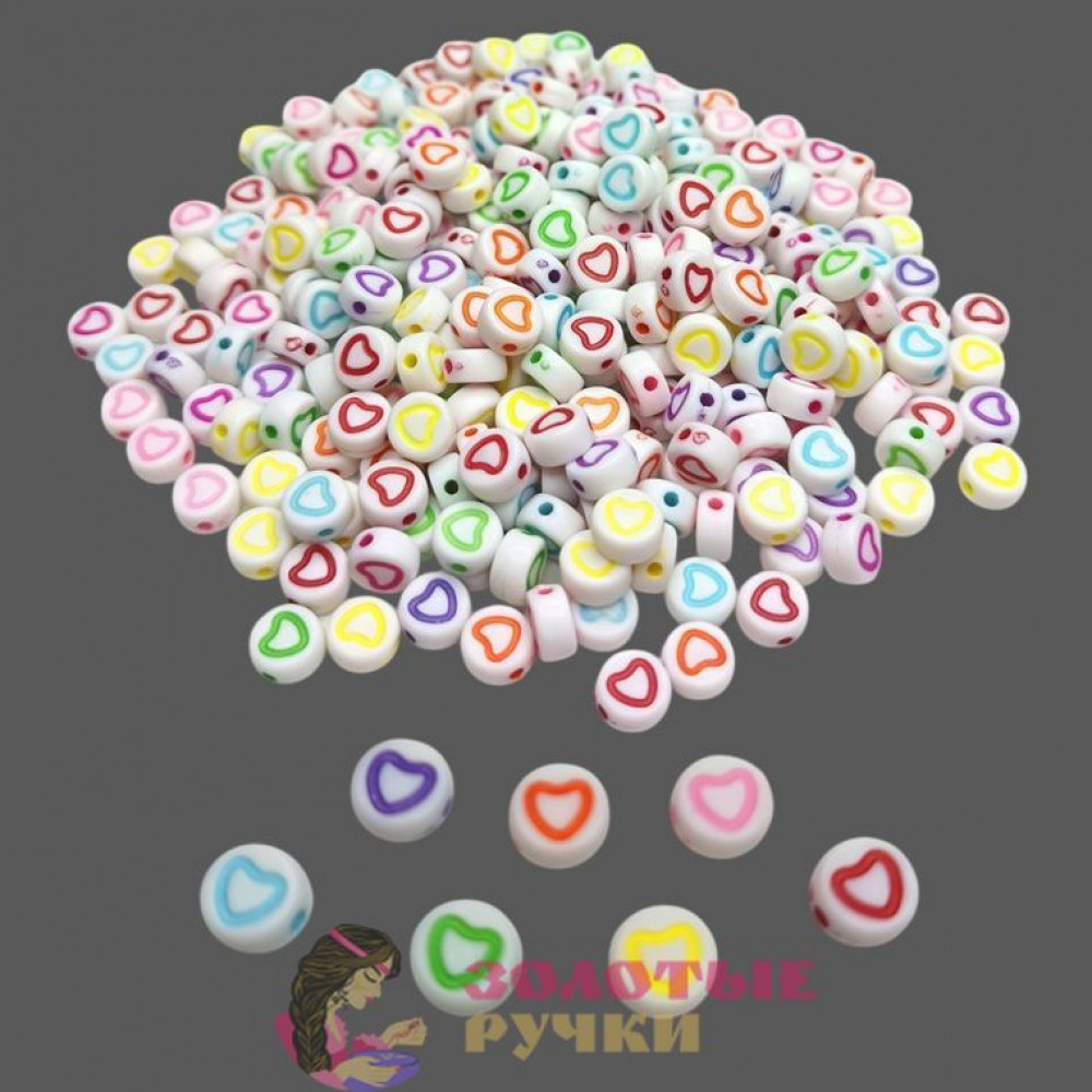 Бусины круглые "Сердечки". Цвет: белый с разноцветными сердечками. Количество в упаковке: 500 гр.