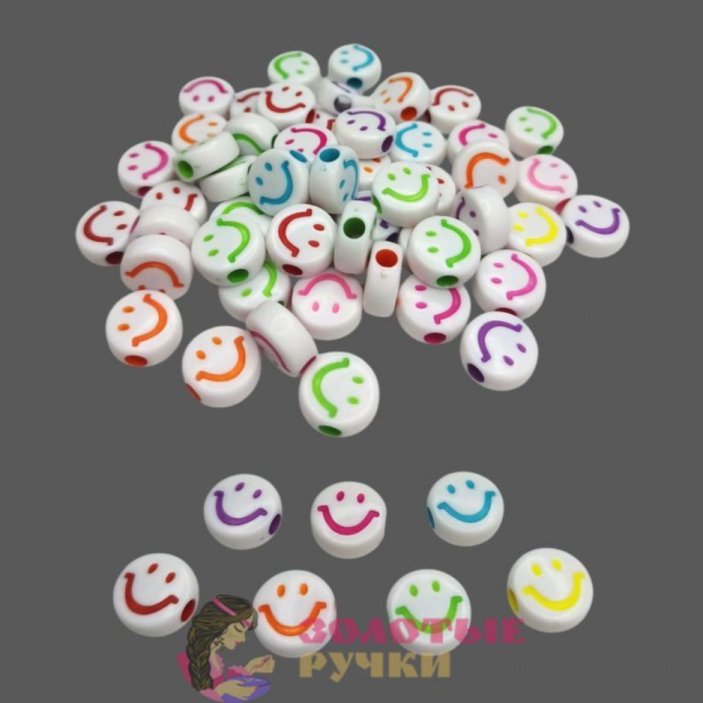 Бусины круглые "Смайлик". Цвет: белый с разноцветными смайликами. Количество в упаковке: 500 гр.