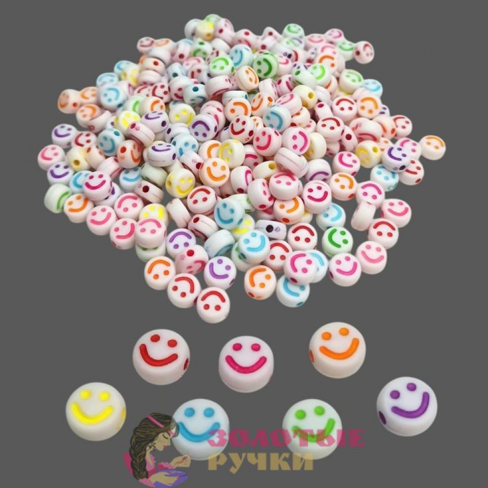 Бусины круглые "Смайлик". Цвет: белый с разноцветными смайликами. Количество в упаковке: 500 гр.