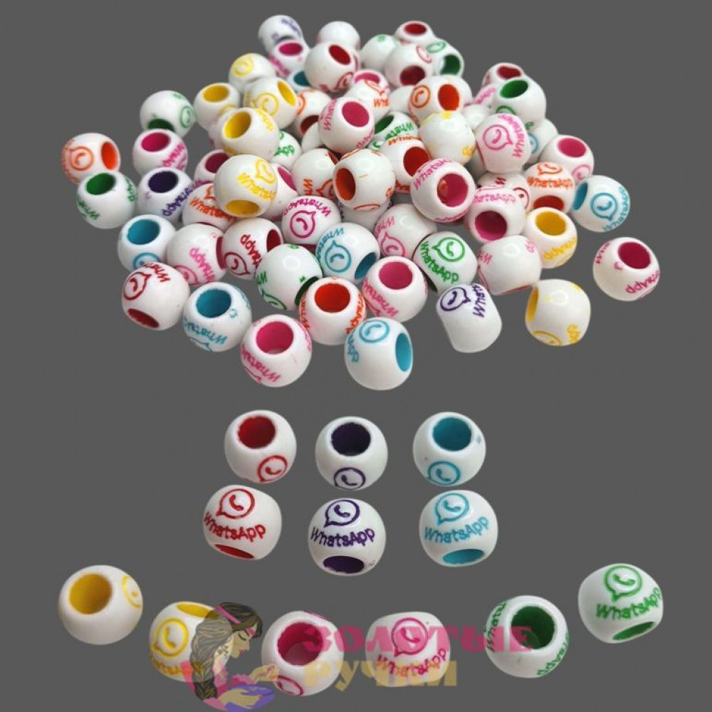 Бусины круглые "WhatsApp". Цвет: белый с разноцветными надписями. Количество в упаковке: 500 гр.