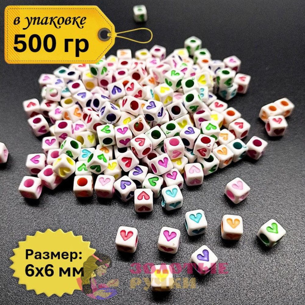 Бусины квадратные "Сердечки". Цвет: белые с разноцветными сердечками. Количество в упаковке: 500 гр.