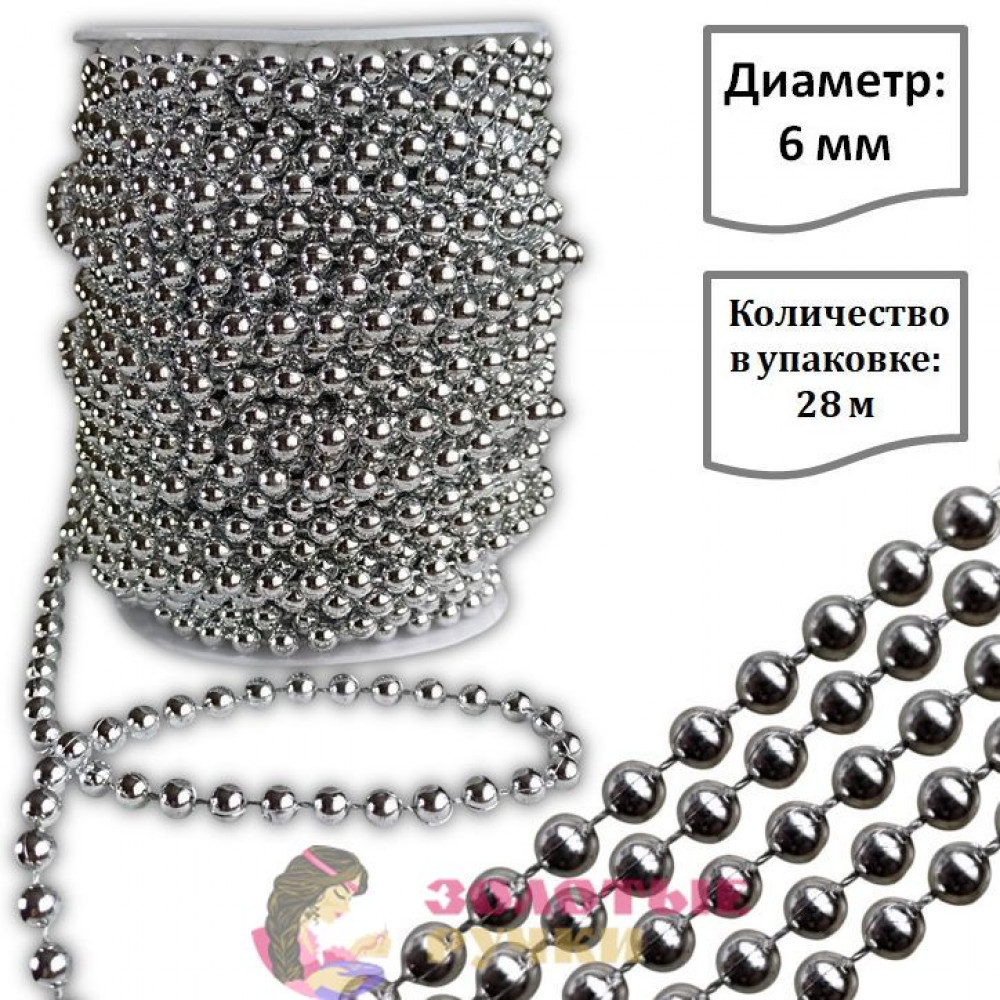 Бусы на бобине. Диаметр: 6 мм. Количество в упаковке: 28 м. Цвет: серебро