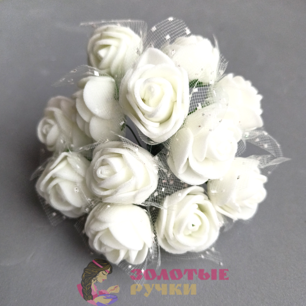 Декоративные цветочки из фоамирана в виде розочки на проволоке с сеточкой из фатина.