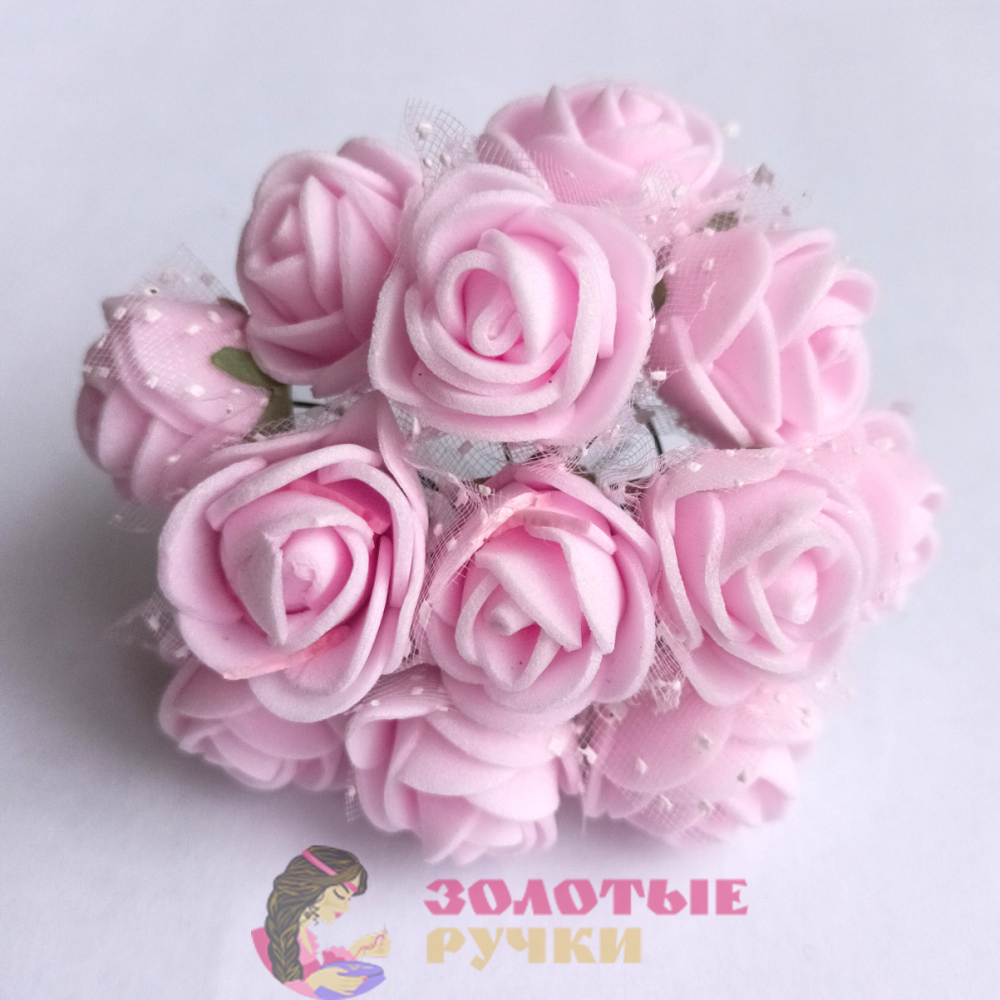 Декоративные цветочки из фоамирана в виде розочки на проволоке с сеточкой из фатина.