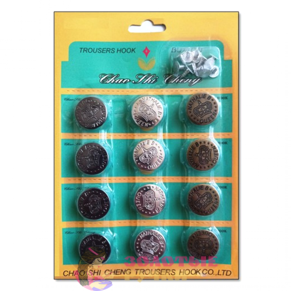 Джинсовые пуговицы состоят из двух частей: верхняя часть - это шляпка, которая может быть гладкая, с рисунками и иметь различные цвета, нижняя - гвоздик, который запрессовывается в шляпку.