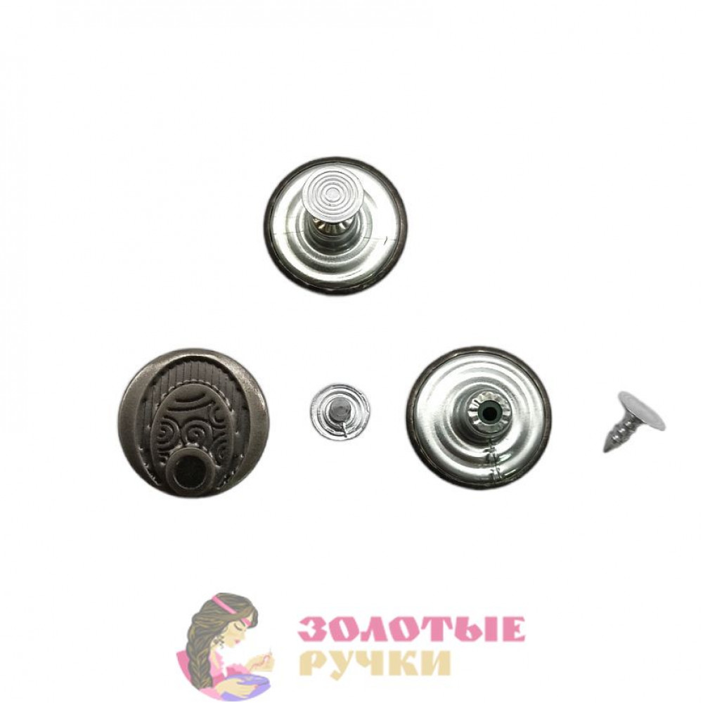 Джинсовые пуговицы состоят из двух частей: верхняя часть - это шляпка, которая может быть гладкая, с рисунками и иметь различные цвета, нижняя - гвоздик, который запрессовывается в шляпку.