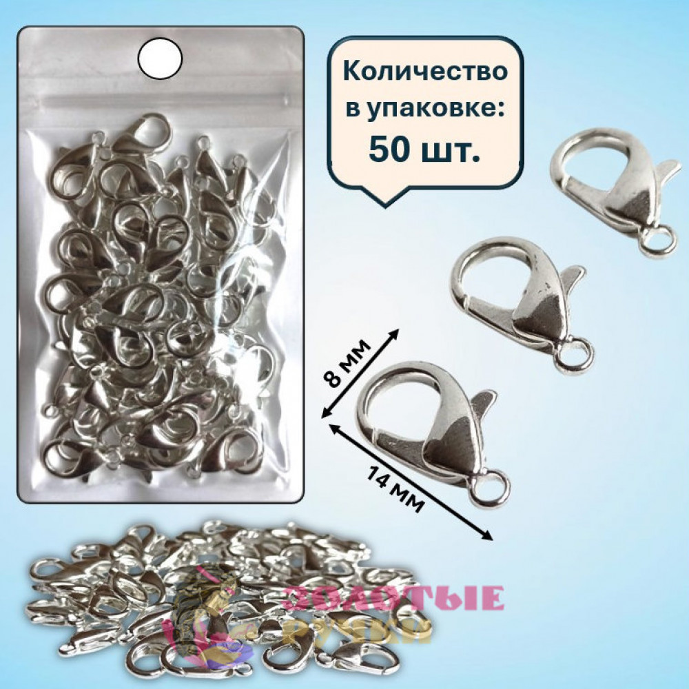 Карабин для бижутерии. Размер: 14*8 мм. Цвет: серебро. Количество в упаковке: 50 шт.