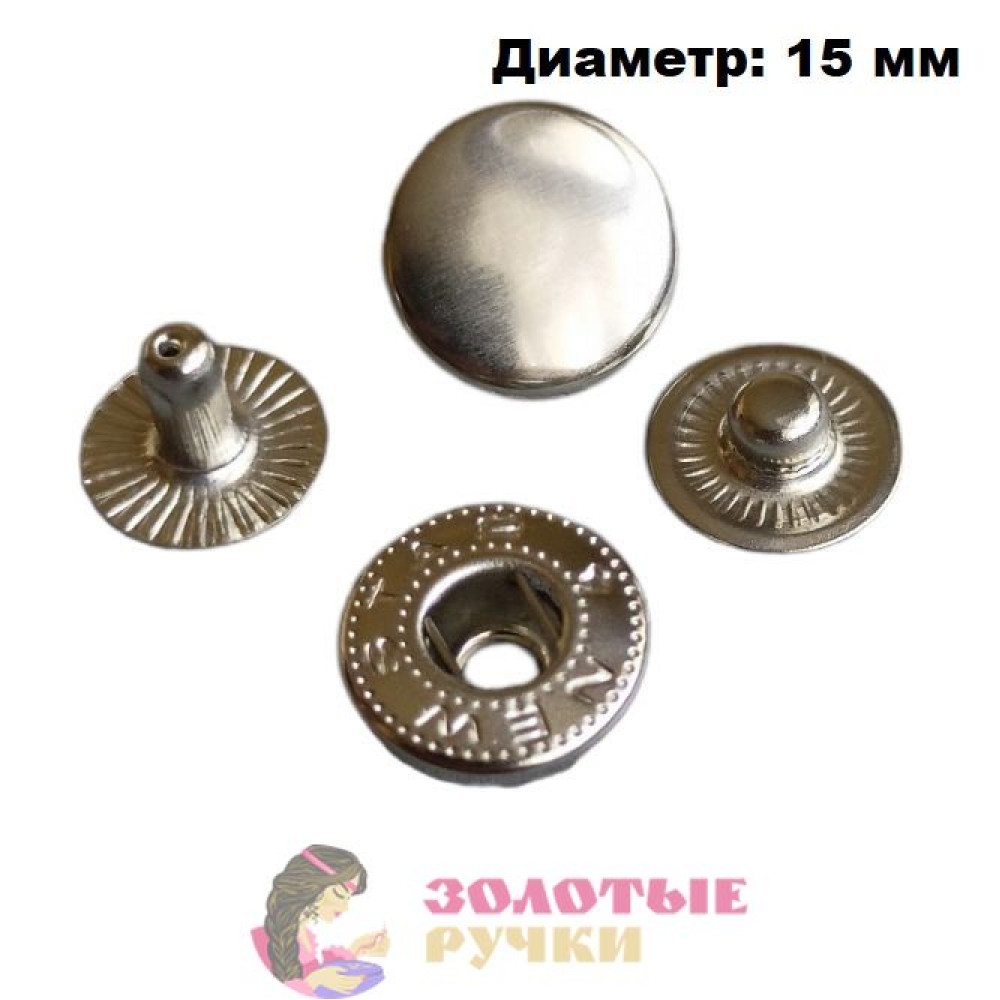 Кнопки "АЛЬФА" из 4-х частей. Размер: 15 мм. Цвет: серебро. В упаковке 50 комплектов.