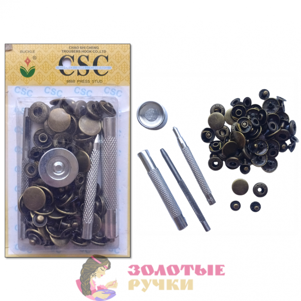 Кнопки для одежды металлические с установщиком и пробойником. Цвет: бронза.