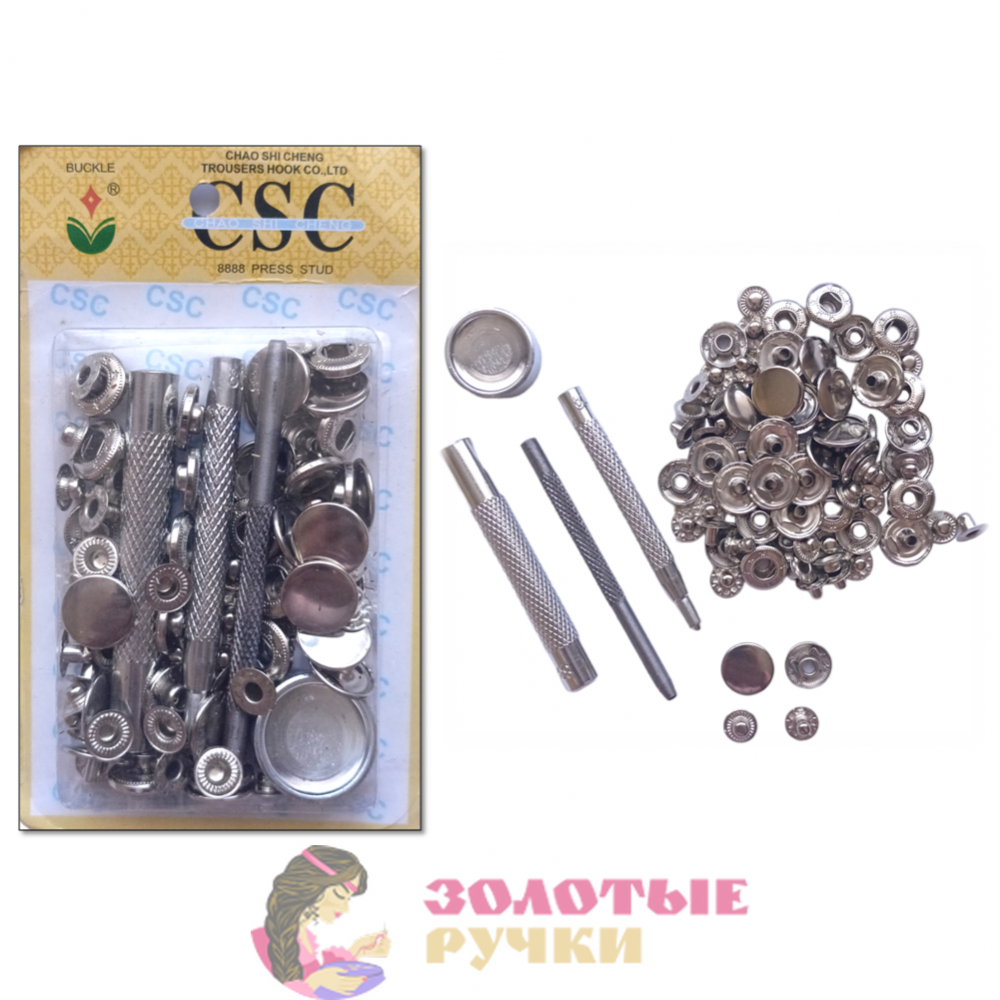 Кнопки для одежды металлические с установщиком и пробойником. Цвет: серебро.