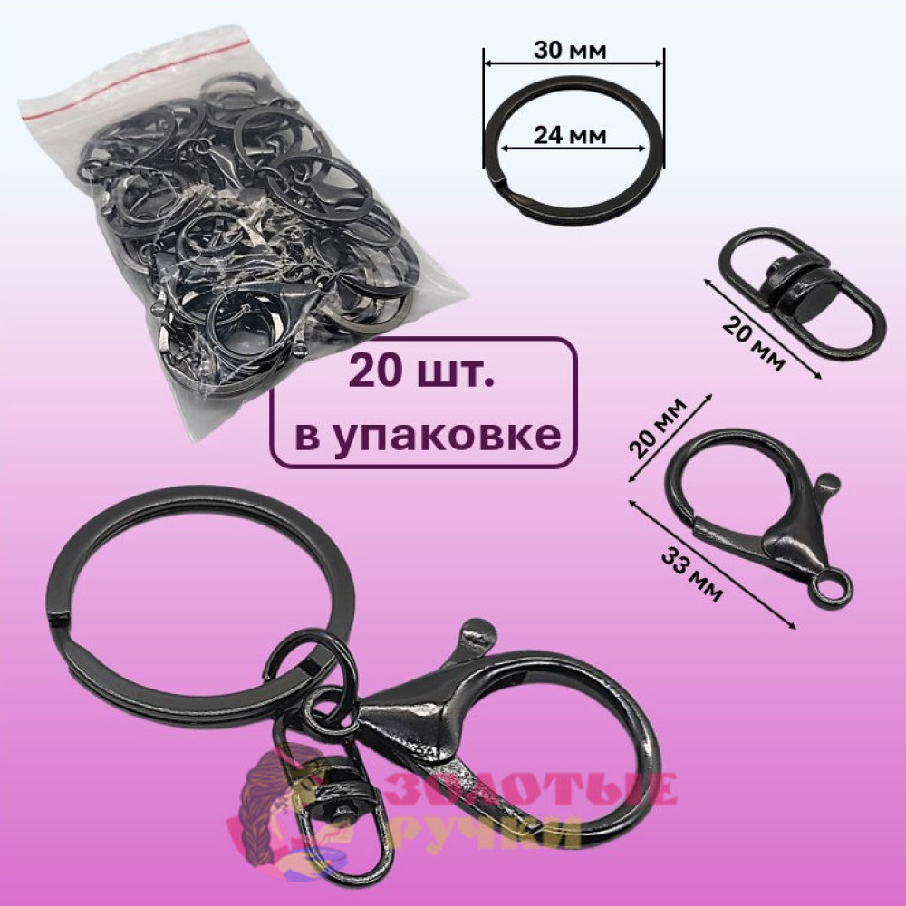 Кольцо с карабином и двойным поворотным крючком. Количество в упаковке: 20 шт. Цвет: темный никель