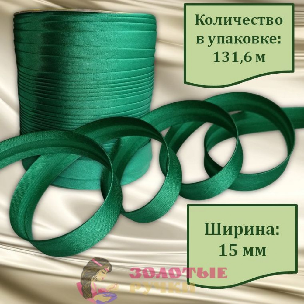 Косая бейка атласная. Ширина: 15 мм. Количество в упаковке: 131,6 м. Цвет: изумрудный