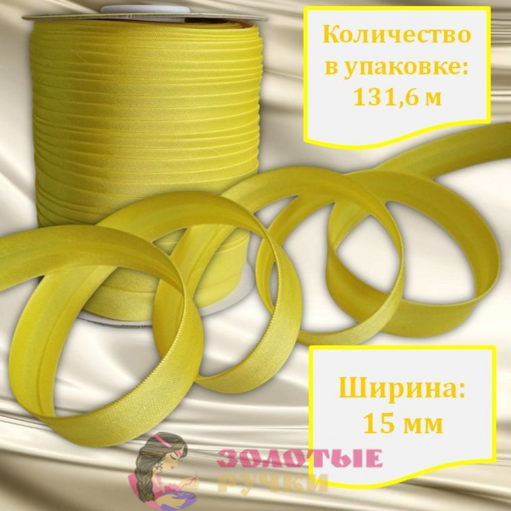 Косая бейка атласная. Ширина: 15 мм. Количество в упаковке: 131,6 м. Цвет: желтый