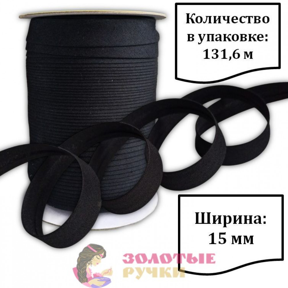 Косая бейка ХБ, ширина 15 мм, намотка 132 метров, цвет черный однотонный