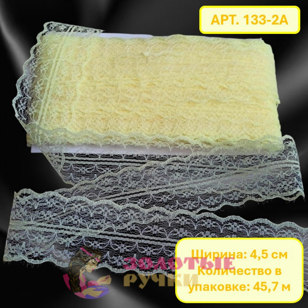 Кружево капроновое. Ширина: 4,5 см. Количество в упаковке: 45 м. Цвет: светло-желтый