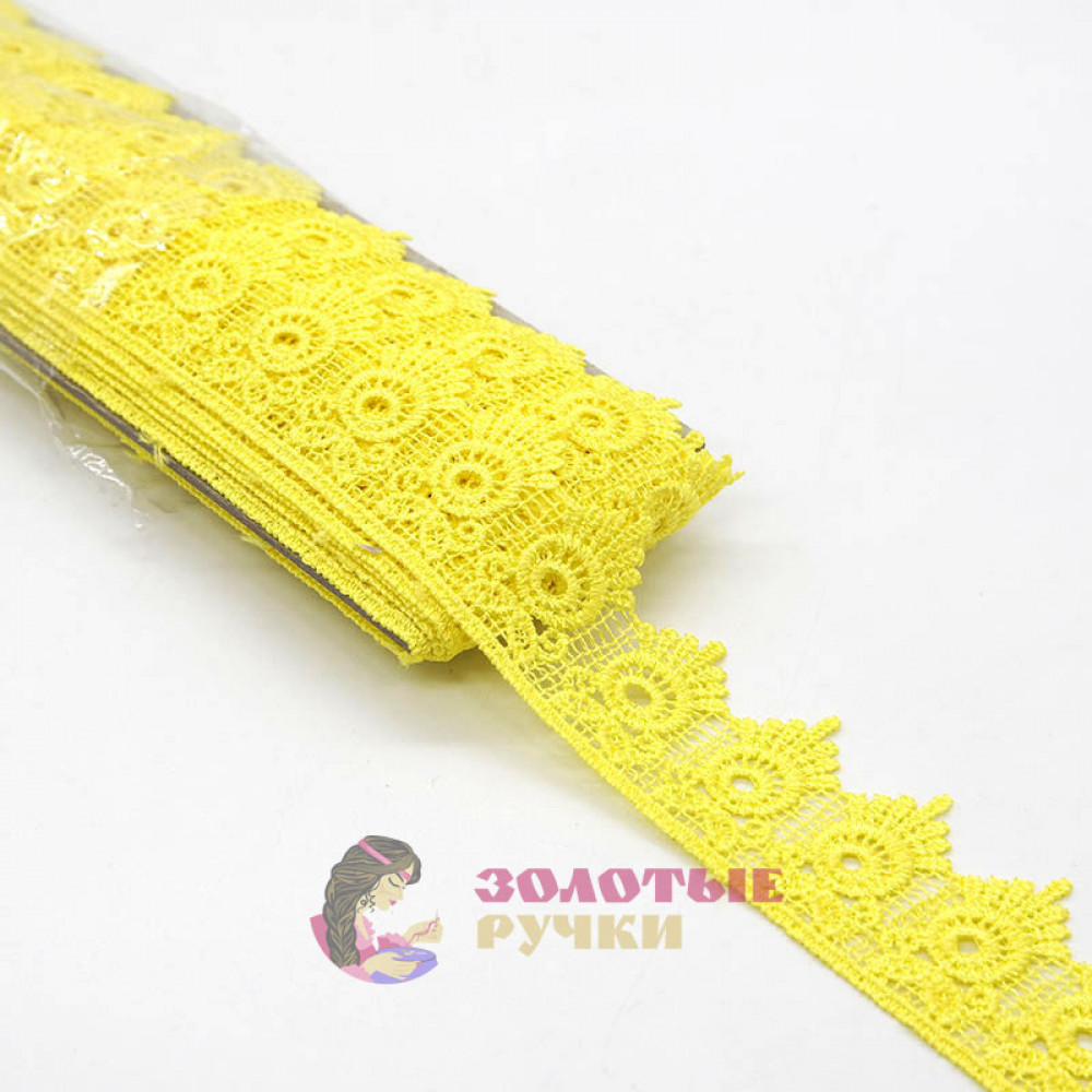 Кружево плетеное, ширина 5 см, в упаковке 9,5 метров, цвет желтый - нежный ажурный материал, способный стать утонченным украшением любого изделия. Прекрасно подходит для отделки различных элементов одежды и аксессуаров. Можно использовать в качестве подкладки или наружной отделки различных видов «базовой» одежды, нижнего белья, игрушек, аксессуаров и т.д.