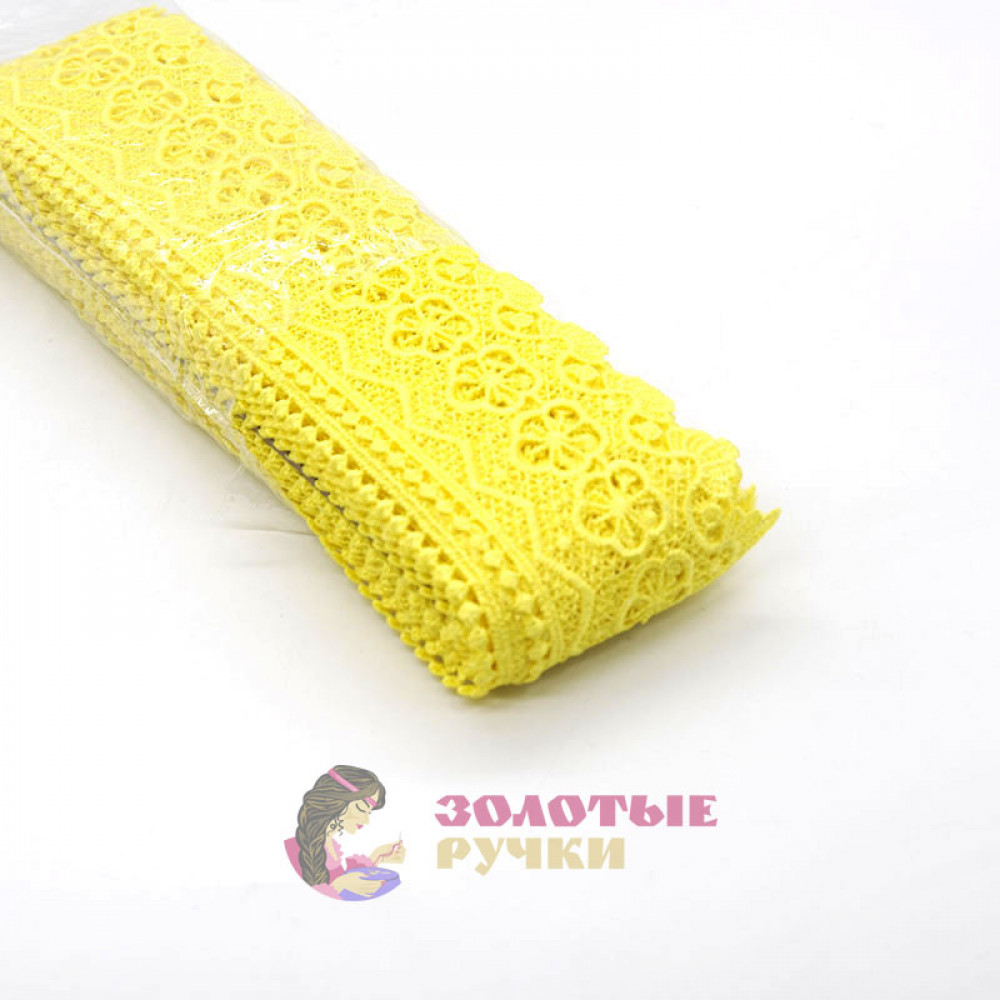 Кружево плетеное, ширина 8 см, в упаковке 9,5 метров, цвет желтый - нежный ажурный материал, способный стать утонченным украшением любого изделия. Каждое кружево имеет уникальный рисунок. Можно использовать в качестве подкладки или наружной отделки различных видов «базовой» одежды, нижнего белья, игрушек, аксессуаров и т.д.