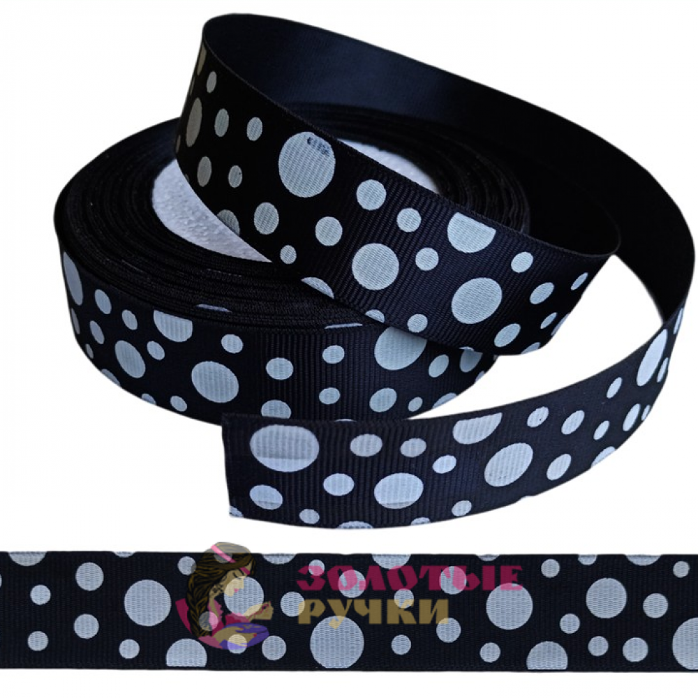 Лента декоративная репсовая "ГОРОШЕК". Ширина: 25 мм. Цвет: черный в белый горошек