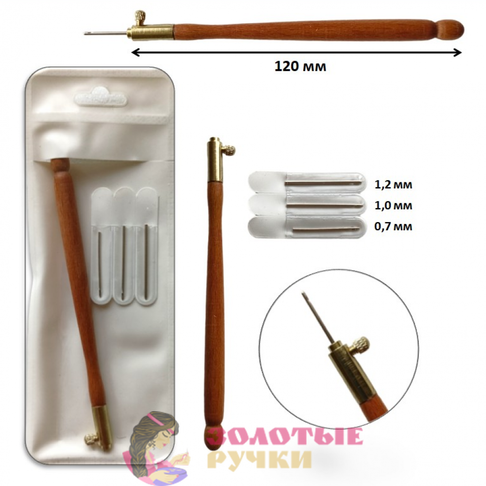 В наборе ручка-держатель и 3 иглы (0,7; 1,0; 1,2 мм).