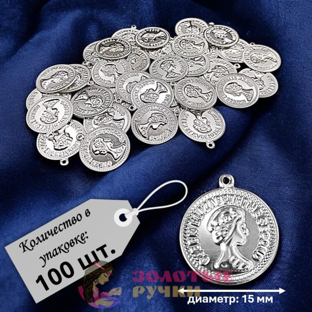 Монетки декоративные. Диаметр: 15 мм. Цвет: серебро. Количество в упаковке: 100 шт.