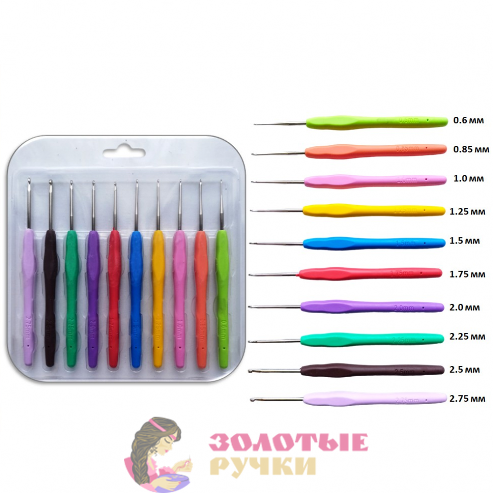 Набор включает крючки размером: 0.6/ 0.85/ 1.0/ 1.25/ 1.5/ 1.75/ 2.0/ 2.25/ 2.5/ 2.75 мм