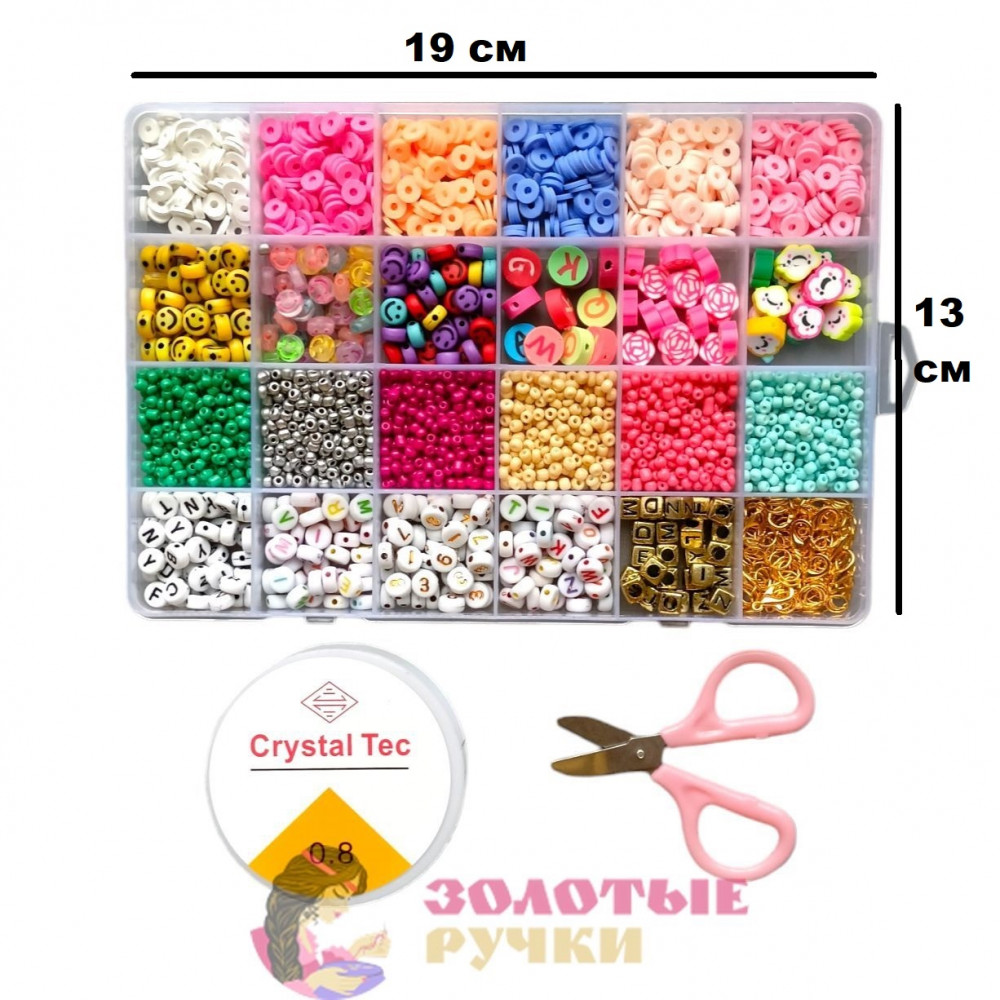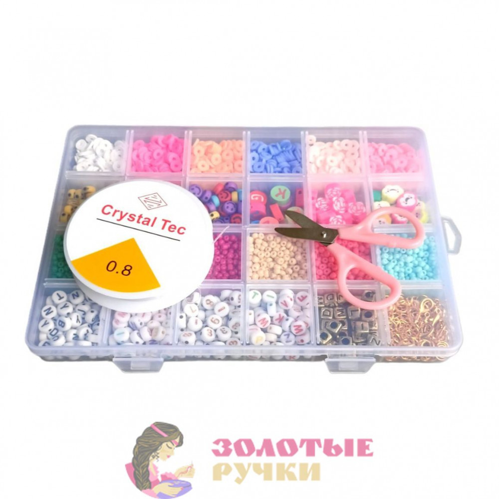 Набор бисера и бусин ( 24 ячейки ) с леской-размер: 0.8 и ножницами .