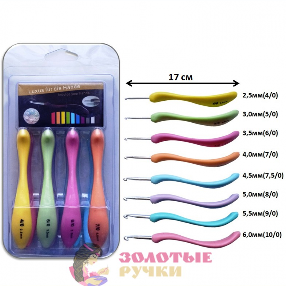 Набор включает крючки размером: 2,5/ 3/ 3,5/ 4/ 4,5/ 5/ 5,5/ 6 мм