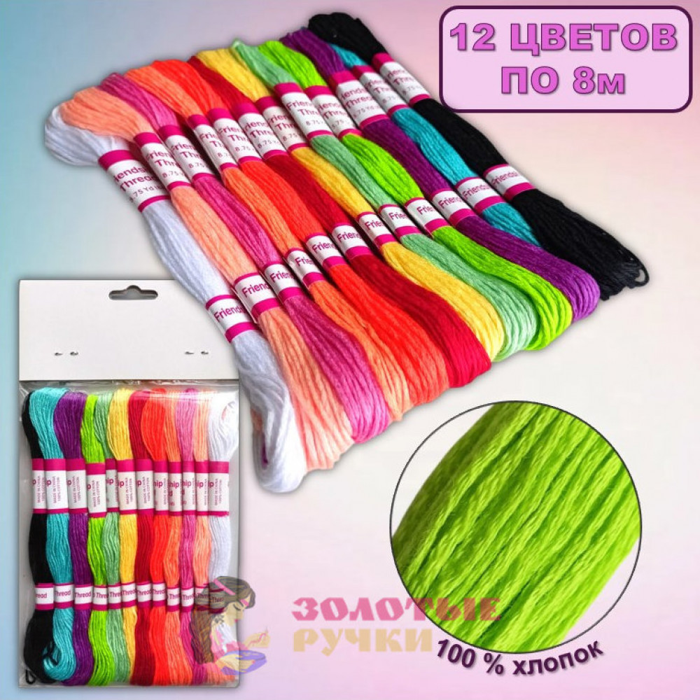 Набор состоит из 12 ярких оттенков - каждый оттенок по 8 м, которые помогут создать красочные и оригинальные вышивки.