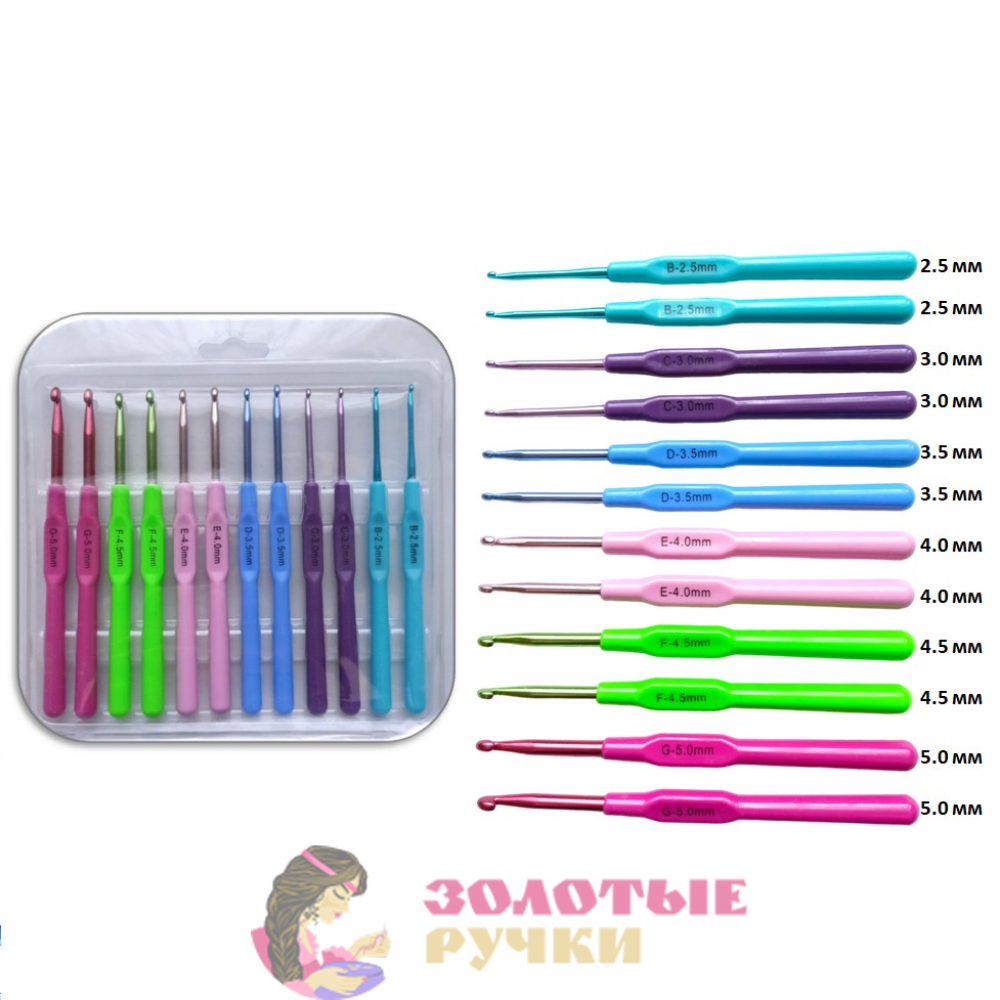 Набор включает крючки размером: 2,5мм - 2 шт./ 3.0мм- 2 шт./ 3,5мм - 2 шт./ 4.0мм - 2 шт./ 4,5мм - 2 шт./ 5.0мм - 2 ш.