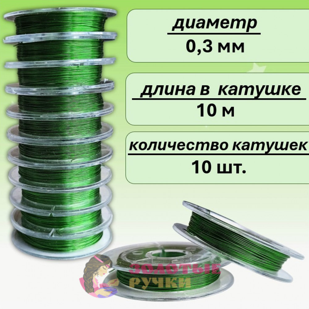 Проволока для бисероплетения. Диаметр: 0,3 мм. Количество в упаковке: 10 шт. по 10 м. Цвет: зеленый