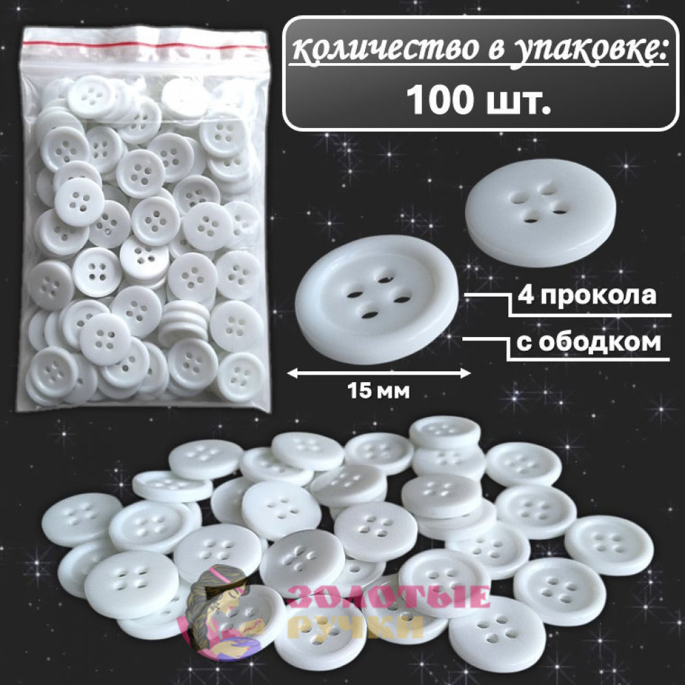 В упаковке 100 пуговиц на 4 прокола, диаметром 15 мм