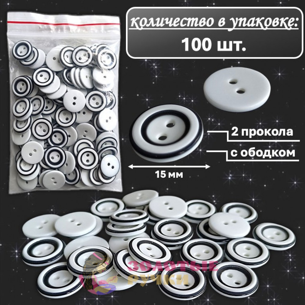Пуговицы черно-белые "4 прокола" с ободком. Диаметр: 15 мм. Количество в упаковке: 100 шт.