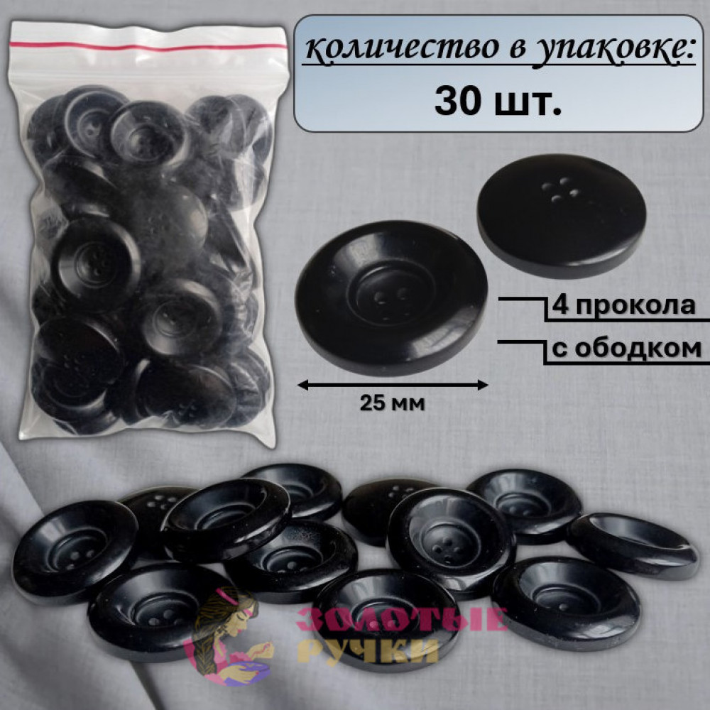 Пуговицы черные "4 прокола" с ободком. Диаметр: 25 мм. Количество в упаковке: 100 шт.