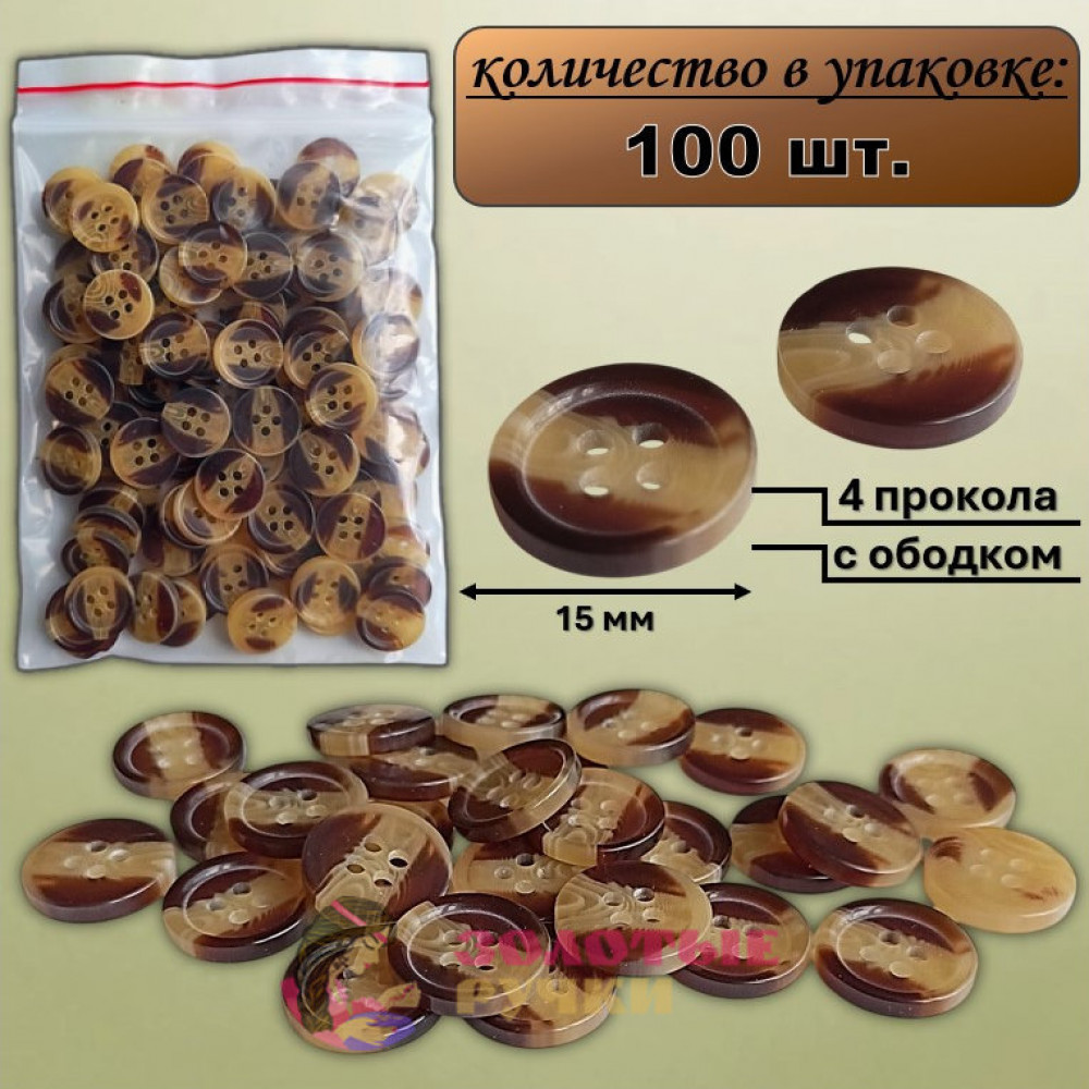 Пуговицы коричневые "4 прокола" с ободком. Диаметр: 15 мм. Количество в упаковке: 100 шт.