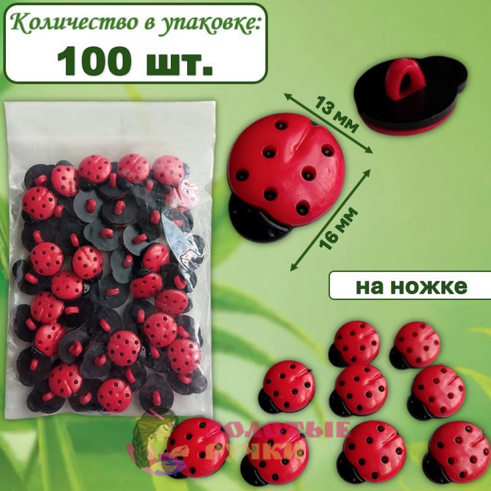 Пуговицы красные "Божьи коровки". Размер: 16*13 мм. Количество в упаковке: 100 шт.