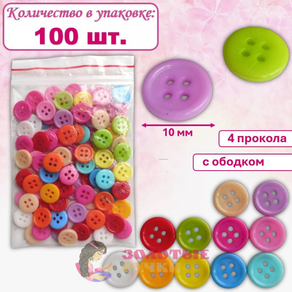 Пуговицы разноцветные "4 прокола" с ободком. Диаметр: 10 мм. Количество в упаковке: 100 шт.
