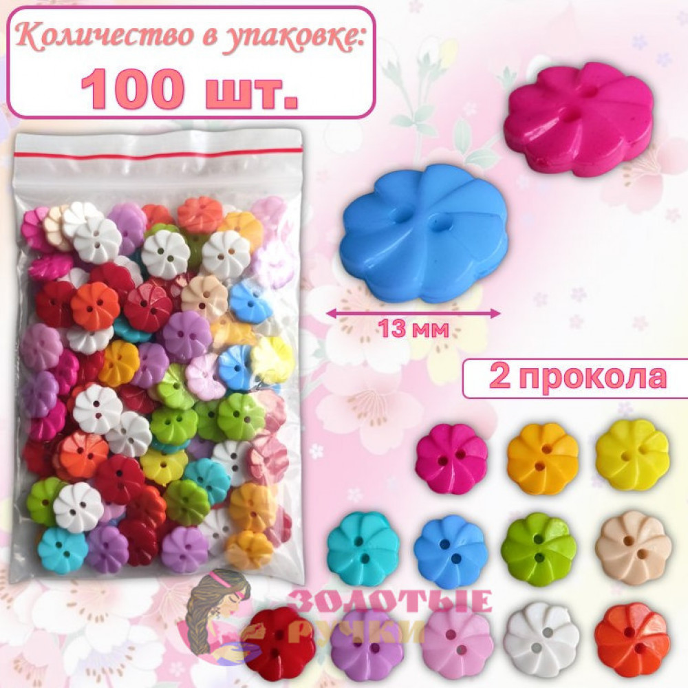 Пуговицы разноцветные "Цветы". Диаметр: 13 мм. Количество в упаковке: 100 шт.