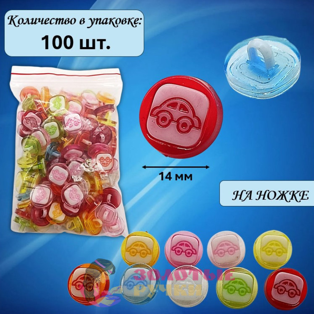 Пуговицы разноцветные "Машинки прозрачные" на ножке. Диаметр: 14 мм. Количество в упаковке: 100 шт.