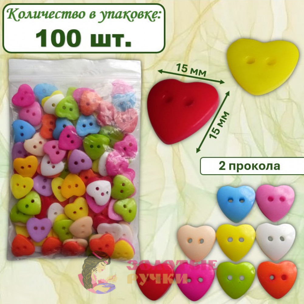 Пуговицы разноцветные "Сердечки". Размер: 15*15 мм. Количество в упаковке: 100 шт.