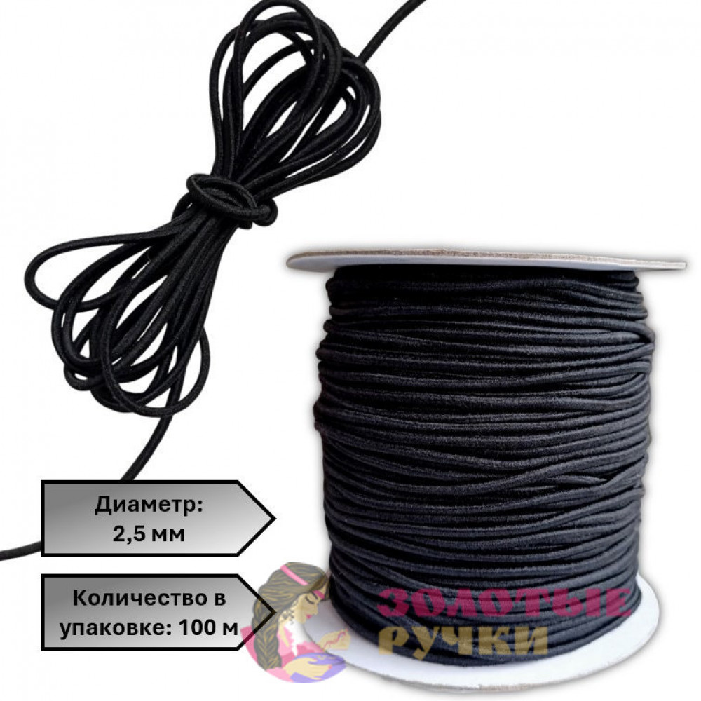 Резинка шляпная. Диаметр: 2,5 мм. Количество в упаковке: 100 м. Цвет: черный