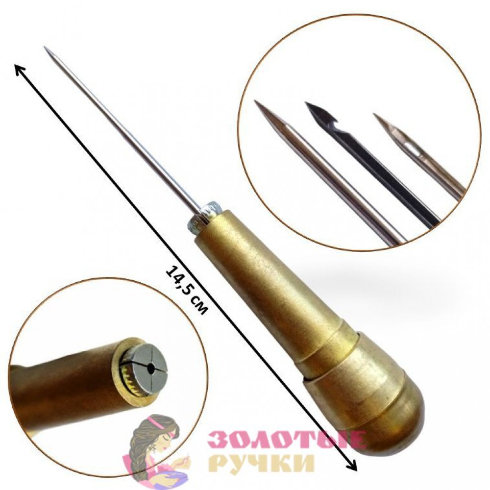 Универсальное металлическое шило сапожное с 3 съемными насадками включает: шило простое, с ушком, с крючком.